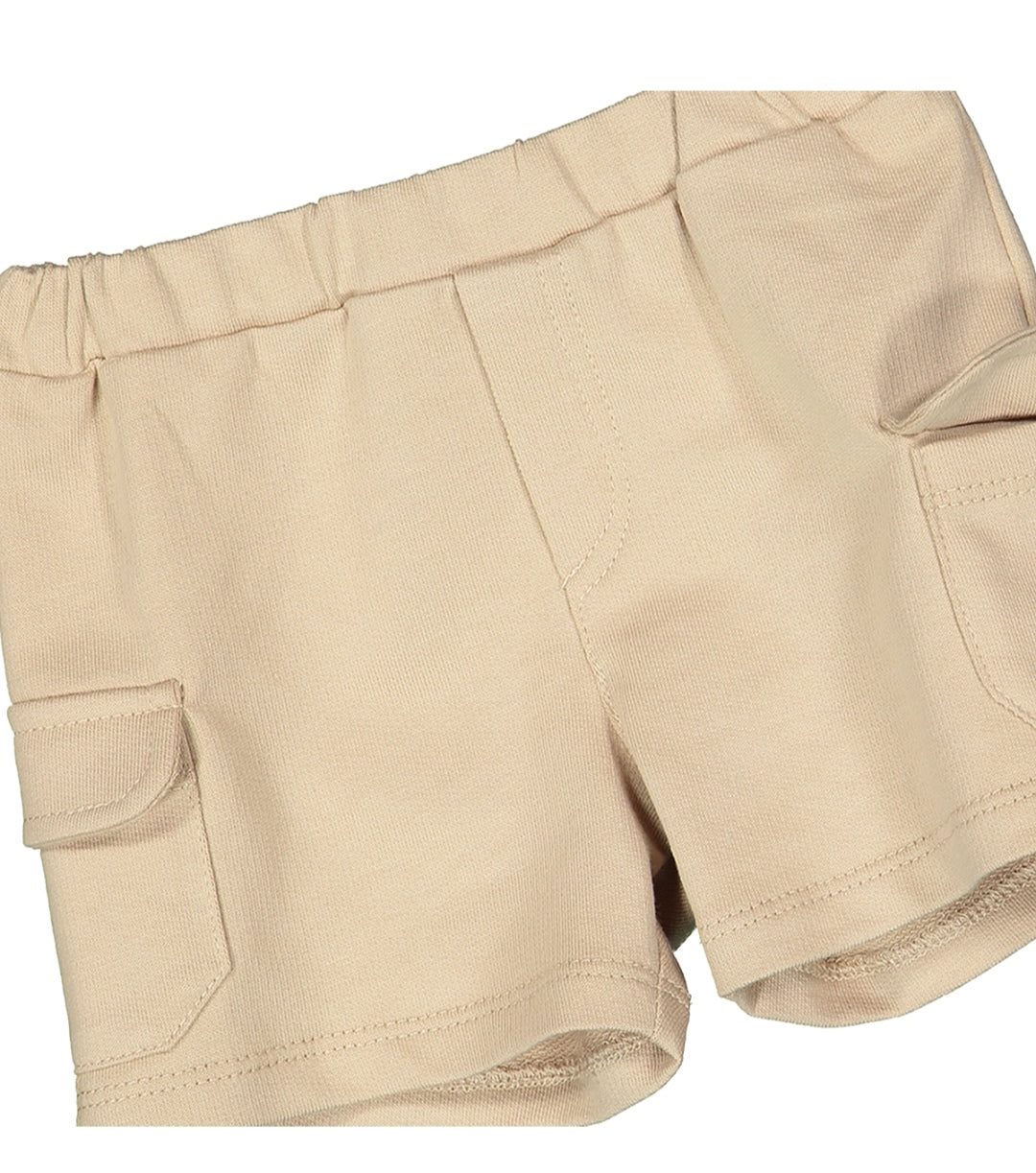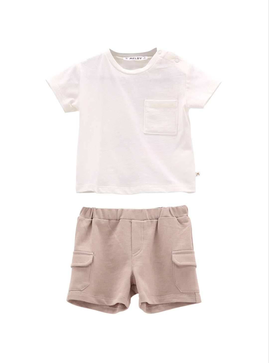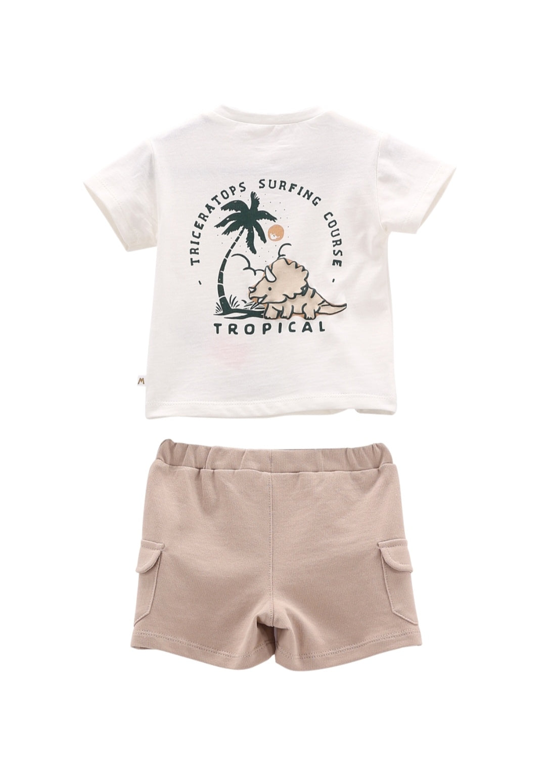 Completo per neonato, composto da un pantaloncino cargo in felpa e da una t-shirt girocollo in jersey di cotone tinta unita. Il tono colore degli shorts viene ripreso dalla simpatica stampa sul retro della maglietta. Taschino frontale applicato.