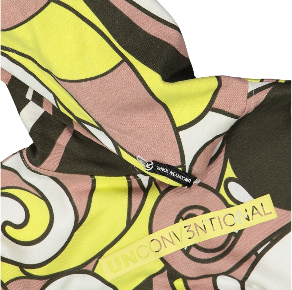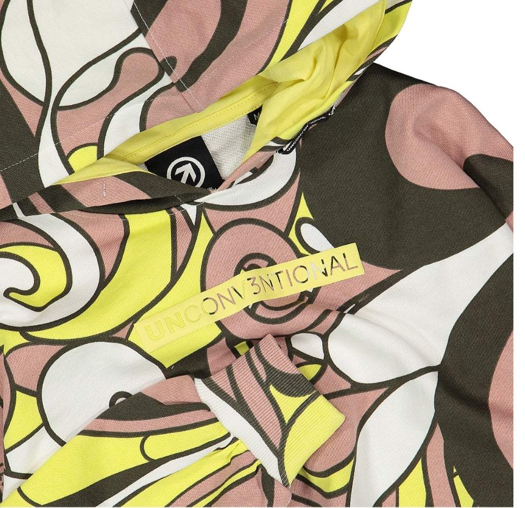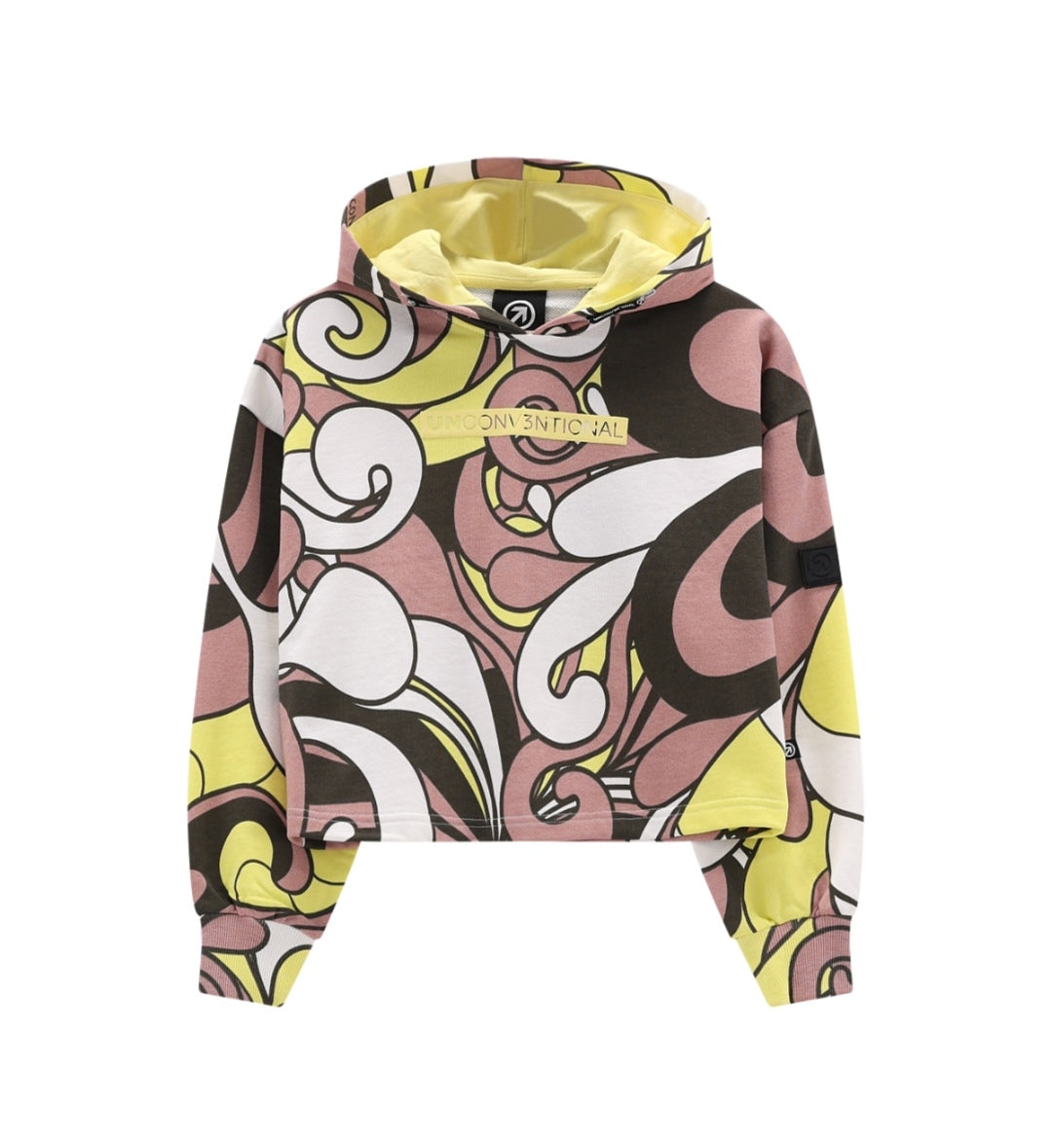 Felpa con cappuccio per ragazza, dal taglio crop e realizzata in morbida felpa 100% cotone con stampa allover. Lavorazione in costina su polsini. Un capo confortevole dal sapore street!